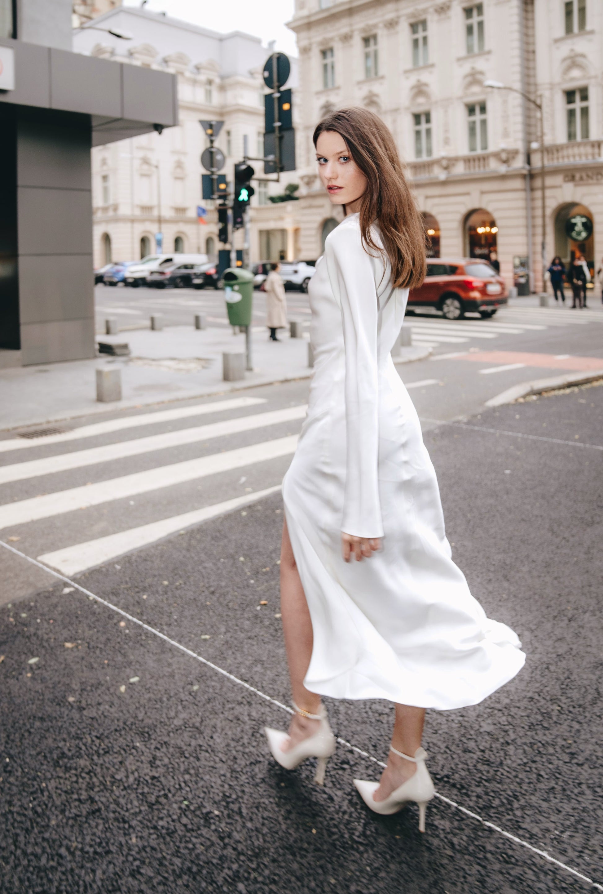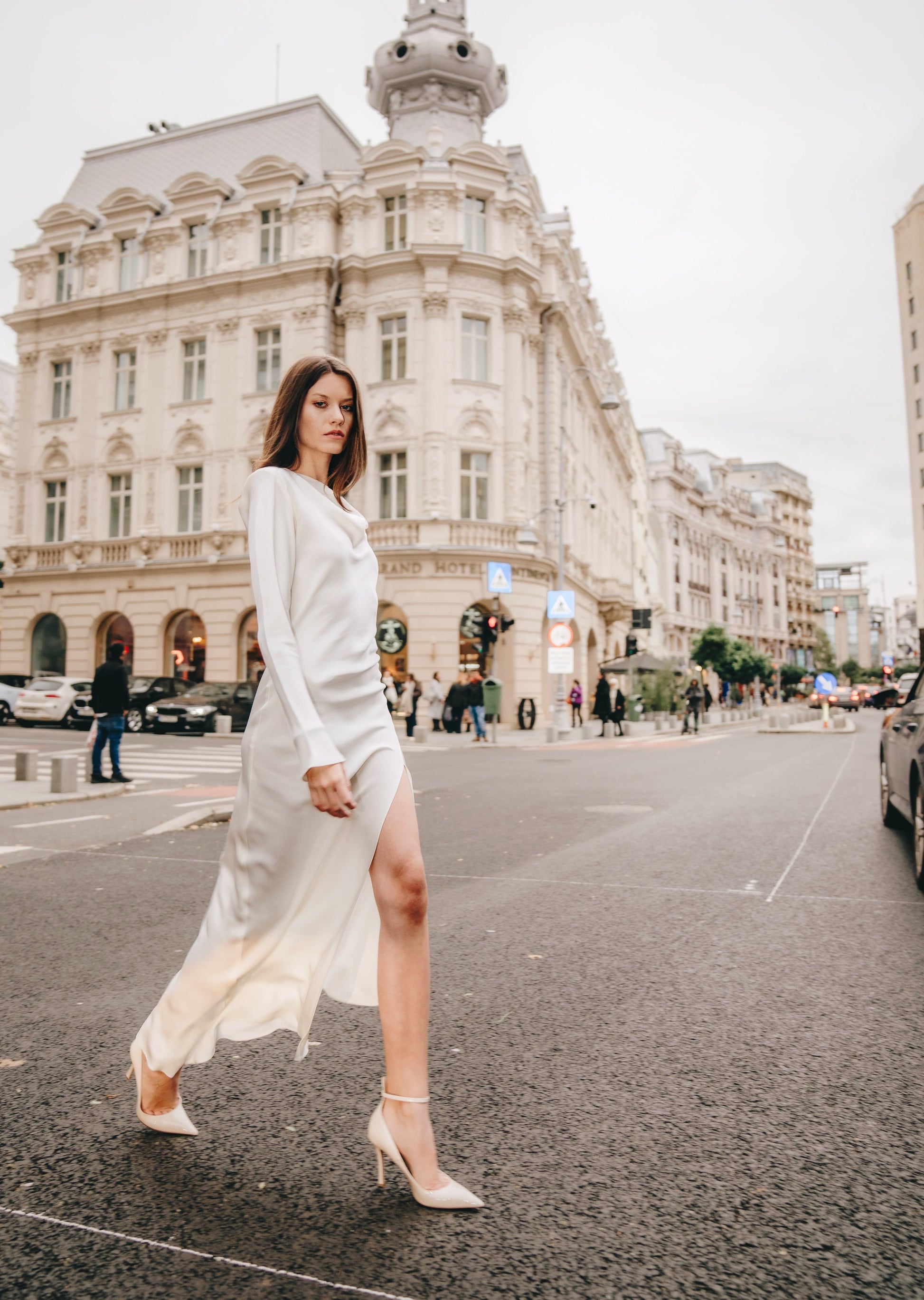 Our Infinity white dress is one of those glamorous wardrobe classics that every woman should have.Slinky in bias-cut lustrous silk ,this dress is characterized by slightly oversized shoulders and a high-hip slit that echoes edge and femininity .
