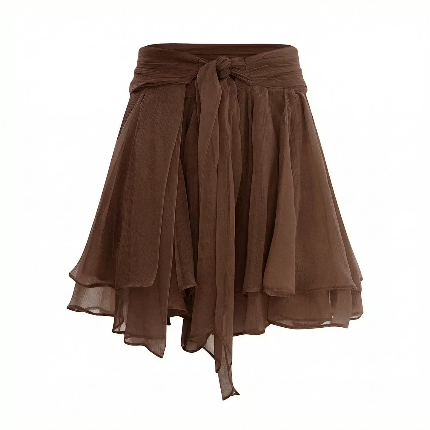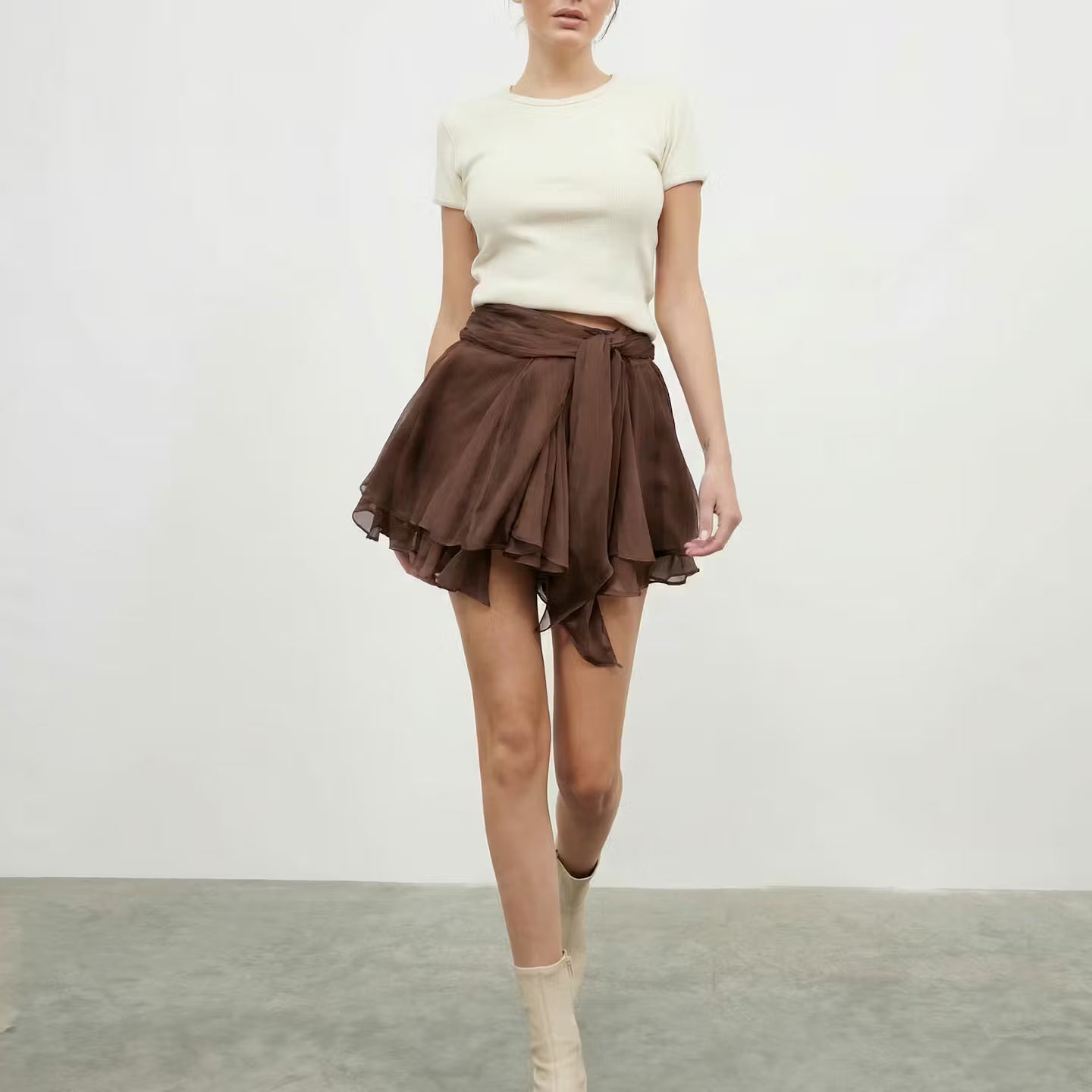 Our Dolce mini skirt will stands out in your wardrobe thanks to its delicate fabric textures. Cut from lightweight silk with a flounced hem and a tie waist this piece emphasis a very feminine , bohemian vibe . Its relaxed fit and airy fabric guarantee a comfortable feel for your off-duty days .